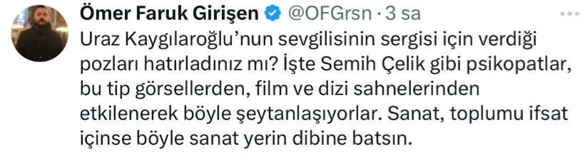 Öte yandan, erkek erkeğe öpüştüğü mide bulandırıcı rolüyle gündeme gelen oyuncu Uraz Kaygılaroğlu'nun da yer aldığı skandal bir fotoğraf çekiminde, kadının kafasını kestiği sahneler "sanat" adı altında servis edilmişti!.. “Topluma hangi mesaj verilmek isteniyor?” yorumları yapılırken, kadına şiddetin, satanist ritüellerin ve kaosun övüldüğü bu iğrenç sözde sanat etkinliklerinin, bu toplumu nereye götürmek istediği merak konusu oldu!..