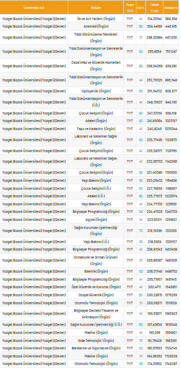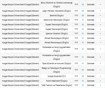 Bozok Üniversitesi 2 yıllık taban puanları 2021, yüzdelik dilimleri ve kontenjan sayıları kaçtır?