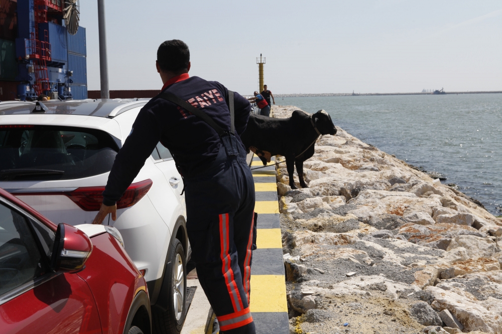 Liman içerisine giden angus, kendisini kovalayanlardan kaçarken, yurtdışına gönderilmek üzere bekleyen sıfır 2 araca çarparak zarar verdi. Bir süre sonra denize atlayan angusu kurtarmak için itfaiye ekiplerine haber verildi.