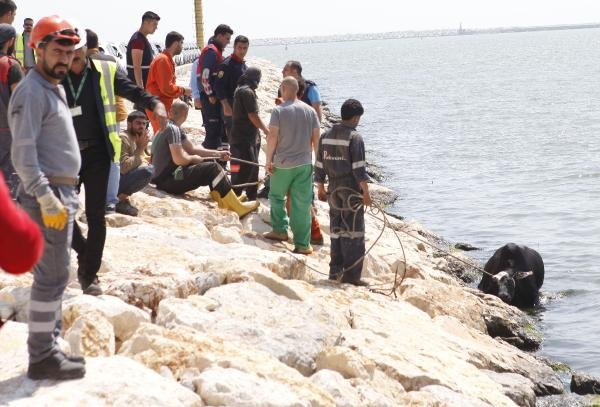 Angusu kurtarmak için harekete geçen ekipler, bot yardımı ile kayalıklara doğru çekilen hayvanın boynuna ip geçirerek kayalıklardan kurtardı.