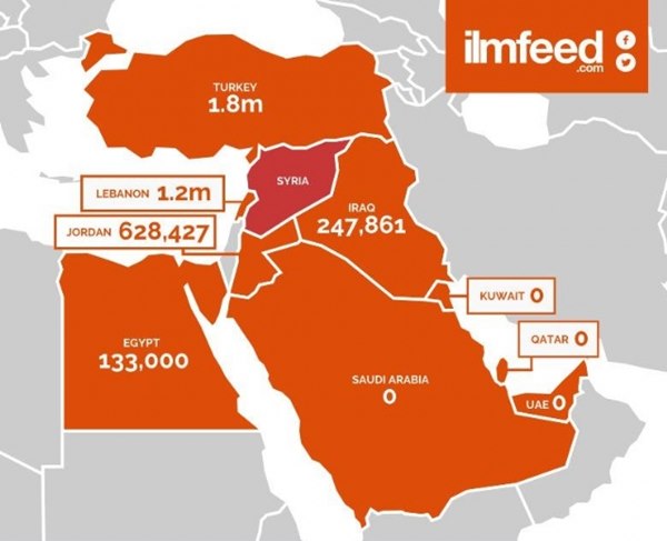 Mülteci yardımlarına en fazla katkıda bulunan ülkelerden biri olan Suudi Arabistan mülteci barındırmaya ise yanaşmıyor. Nedenleri muhafazakâr Arap ülkesinin siyasi yapısından kaynaklanıyor. Aynı şekilde Katar, Kuveyt ve Birleşik Arap Emirlikleri'nde de mülteci sayısı sıfır.