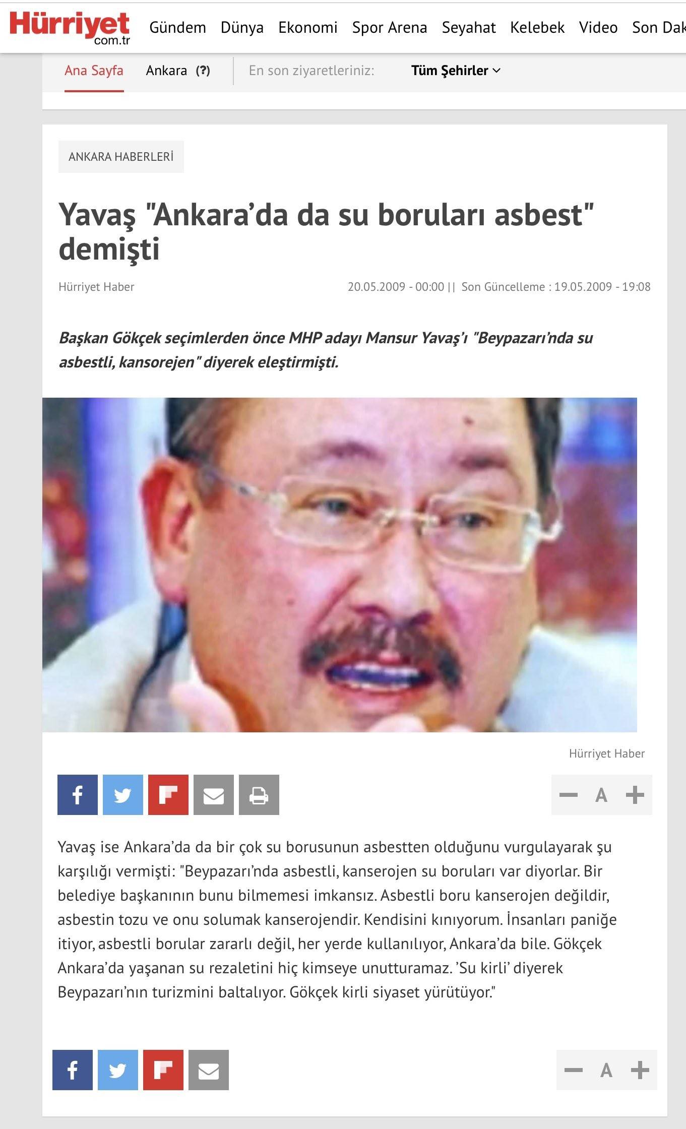 Öte yandan afişe Ankara Eski Büyükşehir Belediye Başkanı Melih Gökçek'te itiraz etti. Gökçek, 2009 yılında kendisinin Beypazarı'ndaki asbestli boruları değiştirirken karşı çıktığını belirterek "Sende hiç utanma yokmu? Gem dün söylediklerinin tersini söyledin, hem de öyle bir afiş astın ki millet zannederki Ankara'nın tüm boruları kanserojen" ifadelerini kullandı.