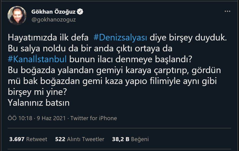 Deniz salyasının Kanal İstanbul'un yapılabilmesi için hükümetin bir oyunu olduğunu iddia eden Özoğuz "Hayatımızda ilk defa deniz salyası diye birşey duyduk.Bu salya n'oldu da bir anda çıktı ortaya da Kanal İstanbul bunun ilacı denmeye başlandı? Bu boğazda yalandan gemiyi karaya çarptırıp, gördün mü bak boğazdan gemi kaza yapıyor filimiyle aynı gibi birşey mi yine? Yalanınız batsın" ifadelerini kullandı.