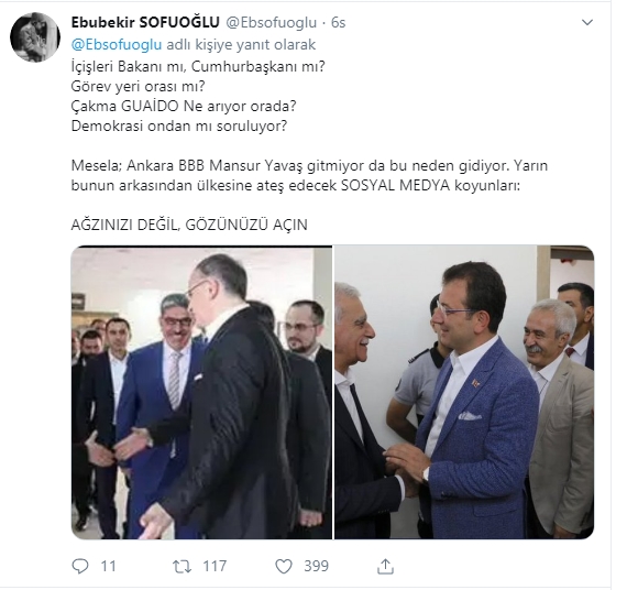 Gözünüzü açın diyerek uyaran Sofuoğlu, "İçişleri Bakanı mı, Cumhurbaşkanı mı? Görev yeri orası mı? Çakma GUAİDO Ne arıyor orada? Demokrasi ondan mı soruluyor? Mesela; Ankara BBB Mansur Yavaş gitmiyor da bu neden gidiyor. Yarın bunun arkasından ülkesine ateş edecek SOSYAL MEDYA koyunları: AĞZINIZI DEĞİL, GÖZÜNÜZÜ AÇIN" dedi.