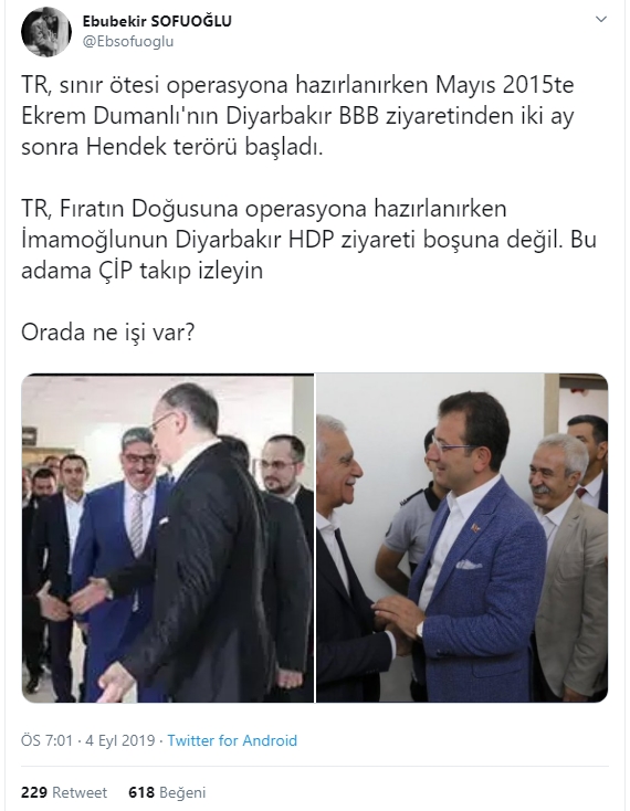 Ebubekir Sofuoğlu, "TR, sınır ötesi operasyona hazırlanırken Mayıs 2015te Ekrem Dumanlı'nın Diyarbakır BBB ziyaretinden iki ay sonra Hendek terörü başladı. TR, Fıratın Doğusuna operasyona hazırlanırken İmamoğlunun Diyarbakır HDP ziyareti boşuna değil. Bu adama ÇİP takıp izleyin. Orada ne işi var?" sözleriyle tepki gösterdi.