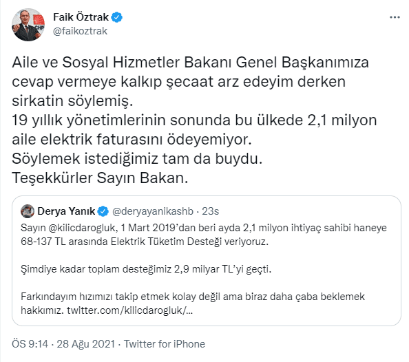 "Aile ve Sosyal Hizmetler Bakanı Genel Başkanımıza cevap vermeye kalkıp şecaat arz edeyim derken sirkatin söylemiş. 19 yıllık yönetimlerinin sonunda bu ülkede 2,1 milyon aile elektrik faturasını ödeyemiyor. Söylemek istediğimiz tam da buydu. Teşekkürler Sayın Bakan."