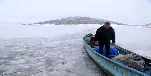 Kış aylarının çok soğuk geçtiği bölgede, gölün karaya bakan tarafı buz tutuyor. Buz kalınlığının yaklaşık 20 santimetreye ulaştığı bölgede, göl adeta bembeyaz ovaya bakıldığı hissi yaratıyor.