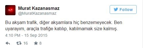 Kazanasmaz Twitter hesabından "Bu akşam trafik diğer akşamlara hiç benzemeyecek. Ben uyarayım, trafiğe katılıp, katılmamak size kalmış" mesajını paylaştı.