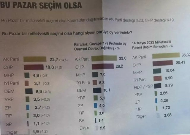 Ankette AK Parti'nin oylarını yüzde 4,6 artırarak 22,7'ye çıkardığı görüldü. Kararsızların da oyları dağıtıldığında AK Parti'nin oyu yüzde 33'e kadar yükseldi.
