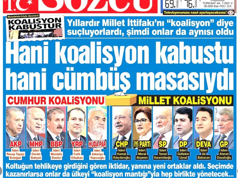 "Koltuğun tehlikeye girdiğini gören iktidar yanına yeni ortaklar aldı. Seçimde kazanırlarsa onlar da ülkeyi "koalisyon mantığı"yla hep birlikte yönetecek" diyen Sözcü'nün haberi "Bu benzetmeye çocuk bile inanmaz!" dedirtti.