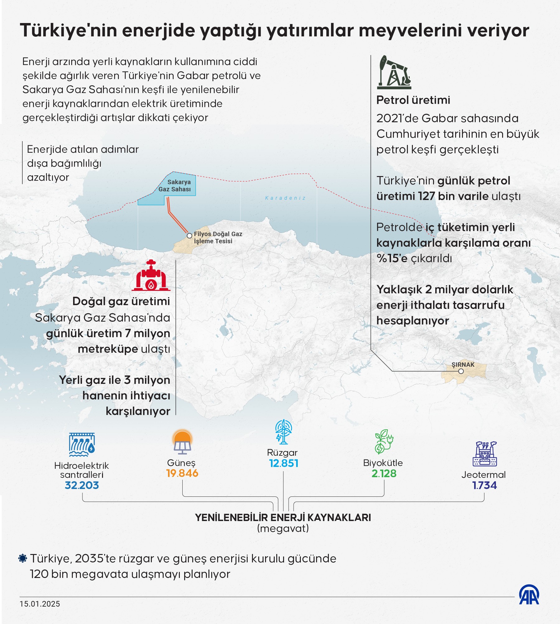 Yenilenebilir enerji kaynaklarının toplam elektrik üretimindeki payını ciddi oranda artıran Türkiye, petrolde iç tüketimi yerli kaynaklarla karşılama oranını yaklaşık yüzde 15'e çıkardı. Yerli gaz ile 3 milyon hanenin ihtiyacı temin ediliyor.