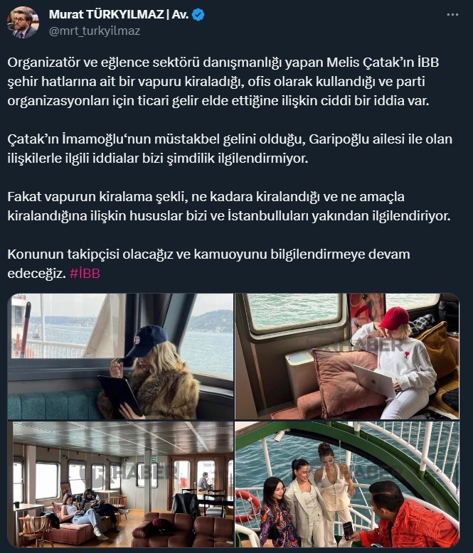 "Organizatör ve eğlence sektörü danışmanlığı yapan Melis Çatak’ın İBB şehir hatlarına ait bir vapuru kiraladığı, ofis olarak kullandığı ve parti organizasyonları için ticari gelir elde ettiğine ilişkin ciddi bir iddia var. Çatak’ın İmamoğlu‘nun müstakbel gelini olduğu, Garipoğlu ailesi ile olan ilişkilerle ilgili iddialar bizi şimdilik ilgilendirmiyor. Fakat vapurun kiralama şekli, ne kadara kiralandığı ve ne amaçla kiralandığına ilişkin hususlar bizi ve İstanbulluları yakından ilgilendiriyor. Konunun takipçisi olacağız ve kamuoyunu bilgilendirmeye devam edeceğiz."