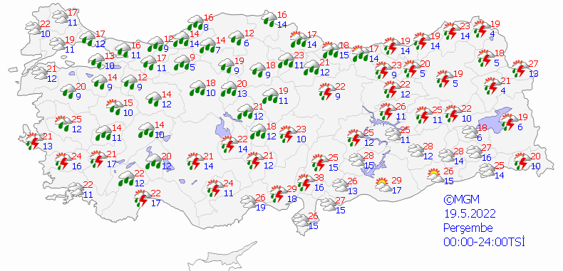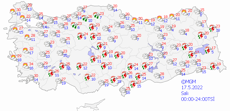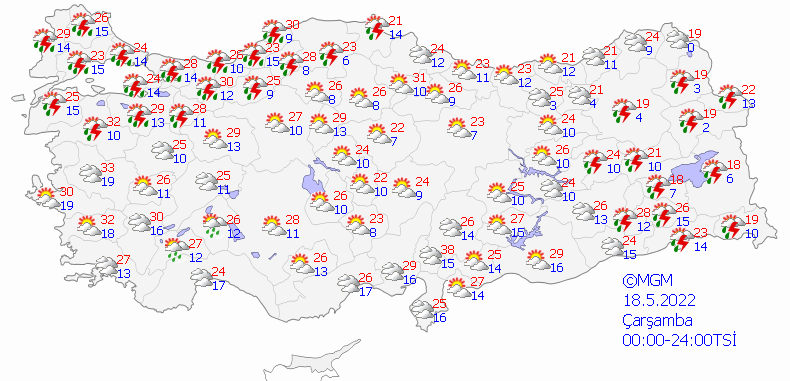 Meteoroloji Genel Müdürlüğü tarafından yapılan son değerlendirmelere göre; Ülkemiz genelinin parçalı ve çok bulutlu, Marmara'nın güneyi ve Trakya'nın kuzeybatısı, İç Ege, Batı Akdeniz'in iç kesimleri, İç Anadolu'nun kuzeybatısı, Doğu Karadeniz'in iç kesimleri ile Bolu ve Ordu çevreleri, Doğu Anadolu'nun doğusunun sağanak ve gök gürültülü sağanak yağışlı geçeceği tahmin ediliyor. Yağışların, Doğu Anadolu'nun kuzeydoğusunda yer yer kuvvetli olması bekleniyor. Doğu Akdeniz'in doğusu ile Güneydoğu Anadolu'nun batısında yer yer toz taşınımı bekleniyor.