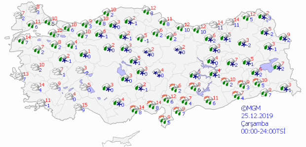 Meteoroloji Genel Müdürlüğü tarafından yapılan son değerlendirmelere göre: ülkemizin batı kesimlerinin parçalı yer yer çok bulutlu, İzmir, Kuzey Ege kıyıları, Çanakkale, Balıkesir'in batısı, Aydın'ın kıyı kesimleri ile gece saatlerinden itibaren Edirne ve Kırklareli çevrelerinin aralıklı yağmur ve sağanak yağışlı, diğer yerlerin az bulutlu ve açık geçeceği tahmin ediliyor.
