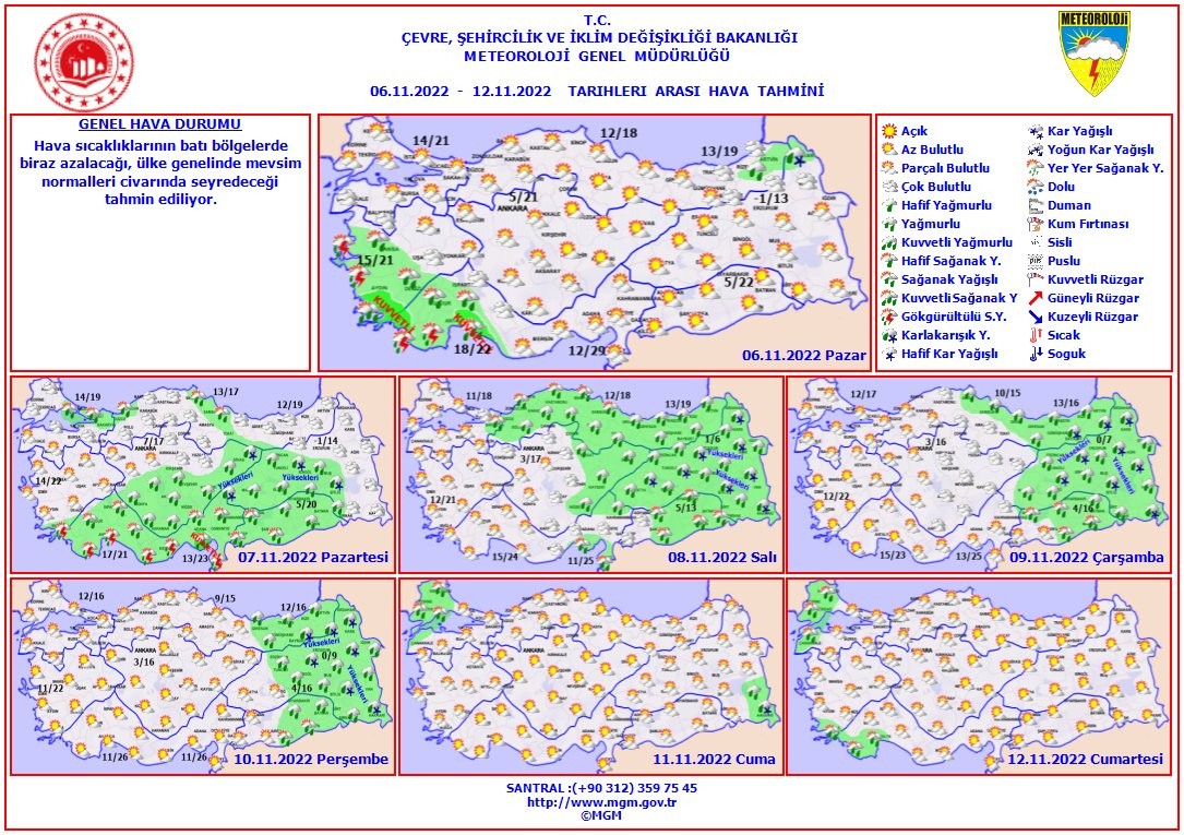 Meteoroloji Genel Müdürlüğü'nden yapılan açıklamada "Haftalık Hava Tahmini (6 - 12 Kasım 2022) Hava sıcaklıklarının batı bölgelerde biraz azalacağı, ülke genelinde mevsim normalleri civarında seyredeceği tahmin ediliyor" denildi.