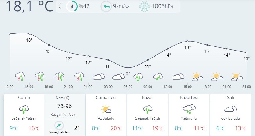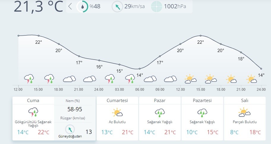 Parçalı ve çok bulutlu, bölge genelinin aralıklı sağanak ve gök gürültülü sağanak yağışlı geçeceği tahmin ediliyor. Rüzgârın; öğle saatlerinden itibaren bölge genelinde güney ve güneybatı yönlerinden kuvvetli (30-60 km/saat) ve kısa süreli fırtına (60-90 km/saat) şeklinde esmesi bekleniyor.