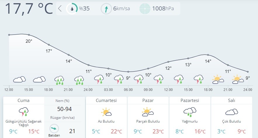 Parçalı ve çok bulutlu, akşam ve gece saatlerinde aralıklı sağanak ve gök gürültülü sağanak yağışlı geçeceği tahmin ediliyor. Yağışların; akşam saatlerinde kuzey ilçelerinde yerel olarak kuvvetli olması bekleniyor.