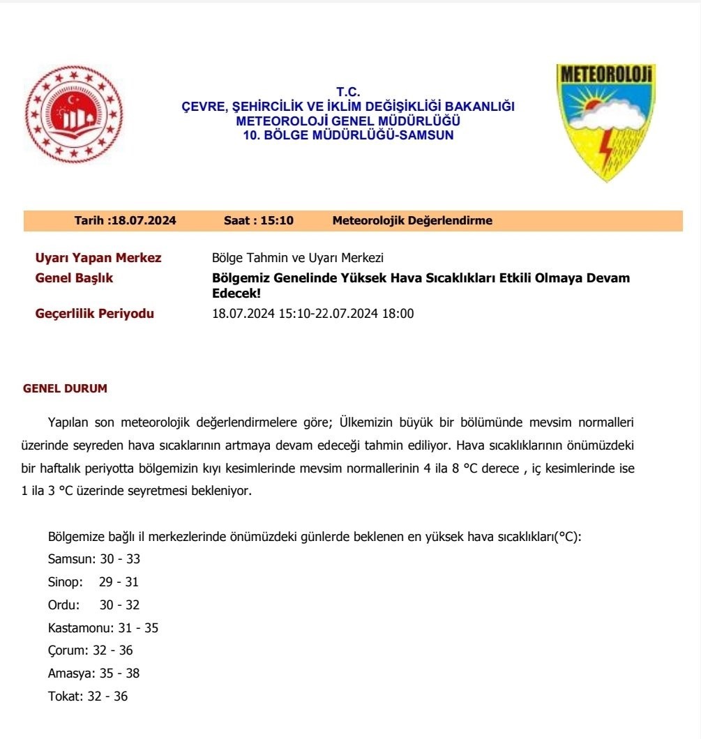 Uyarıda ayrıca Samsun'un yanı sıra aynı tarihlerde hava sıcaklıklarının Sinop'ta 30-33, Ordu'da 30-32, Kastamonu'da 31-35, Çorum'da 32-36, Amasya'da 35-38 ve Tokat'ta 32-36 derece arasında seyredeceğine dikkat çekildi.