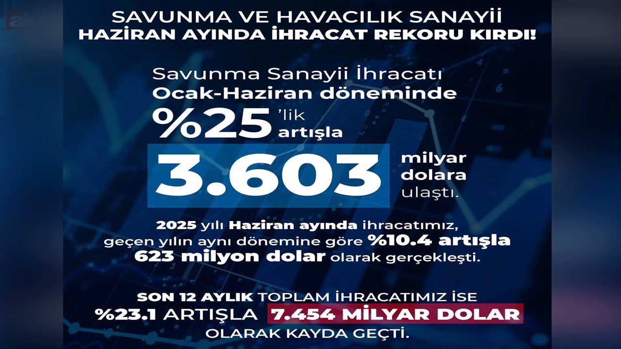 Savunma Sanayii Başkanı Görgün, sosyal medya hesabından yaptığı açıklamada, savunma ve havacılık sanayi ihracatında yeni zirvenin gerçekleştiğini belirterek, "Ocak-haziran döneminde ihracatımız yüzde 25 artışla 3 milyar 603 milyon dolara ulaştı. 2025 yılı haziran ayında ihracatımız, geçen yılın aynı dönemine göre yüzde 10,4 artışla 623 milyon dolar olarak gerçekleşti. Son 12 aylık toplam ihracatımız ise yüzde 23,1 artışla 7 milyar 454 milyon dolar olarak kayda geçti" dedi.
