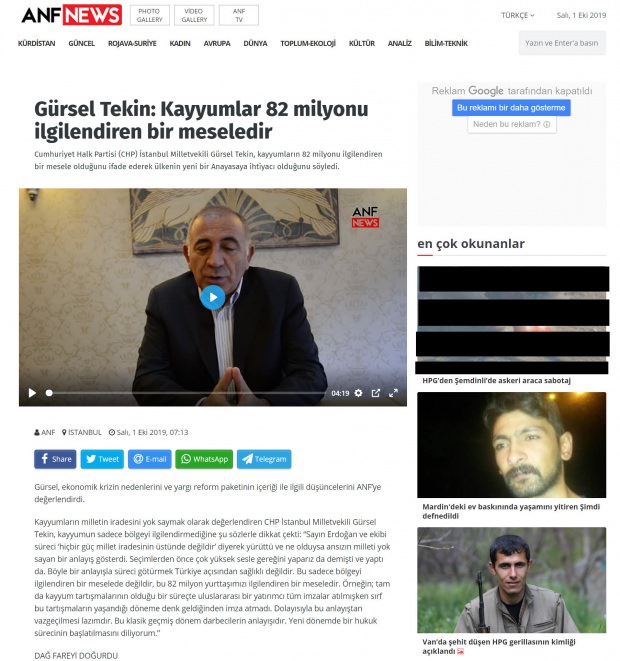 CHP’nin Suriye konulu konferansına terör örgütü PYD yandaşı Amy Austin Holmes’in konuşmacı olarak davet edilip propaganda yapmasına izin verilmesiyle ilgili tartışmalar sürerken, CHP İstanbul Milletvekili Gürsel Tekin terör örgütü PKK’nın medya organı ANF’ye çıktı.