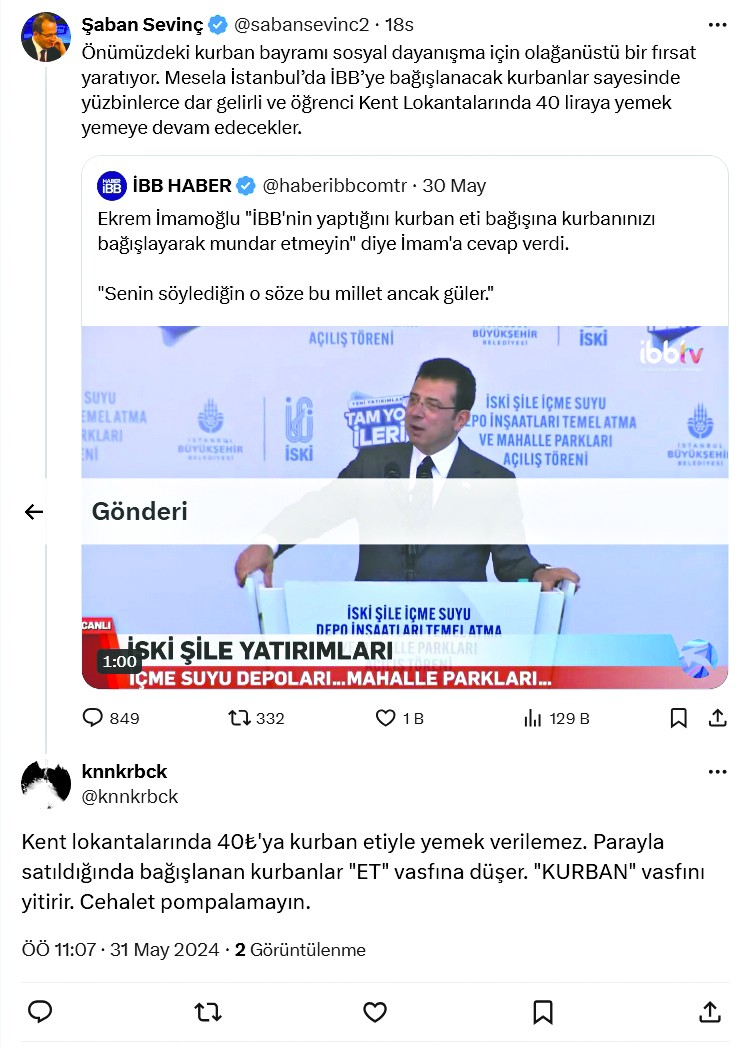 Sinan isimli vatandaş: “Nasıl yani? Ben kurban bağışlayacağım, sonra İBB kurban etlerini alıp Kent Lokantalarında 40 TL’ye satacak mı? Bu nasıl bi akıl, siz bu kadar mı uzaksınız bu ülkenin insanlarına?”