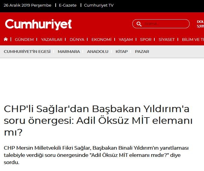 CHP eski Mersin Milletvekili Fikri Sağlar, eski Başbakan Binali Yıldırım'ın yanıtlaması talebiyle verdiği soru önergesinde 15 Temmuz terörist darbesinin kilit isimlerinden firari Adil Öksüz'ün MİT elemanı olup olmadığını sormuştu.