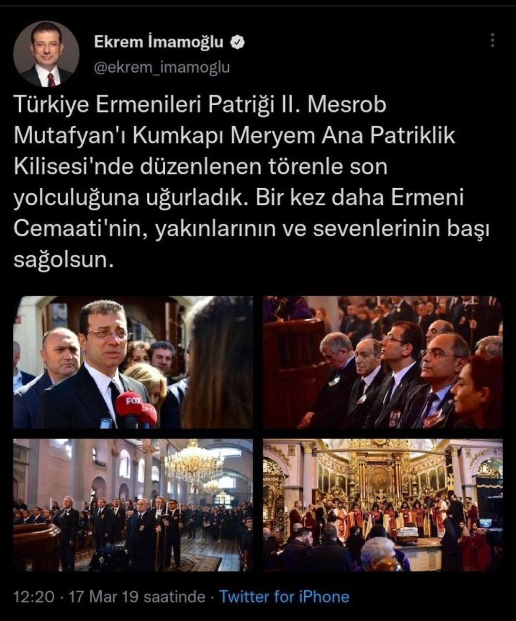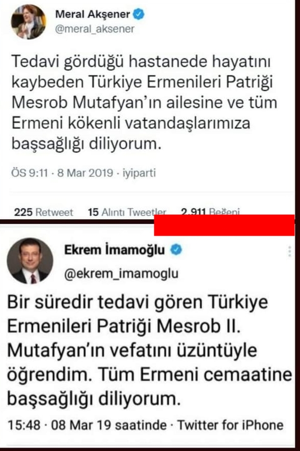 Milli ve manevi değerlerine bağlı neslin yetişmesi için ömrünü vakfeden Türkiye’nin önemli kanaat önderlerinden Mahmut Ustaosmanoğlu Hocaefendinin vefatı nedeniyle bir taziye mesajı dahi yayınlamayan Meral Akşener ve Ekrem İmamoğlu, Ermeni Patriği Mesrob Mutafyan’ın ölümü nedeniyle koşa koşa taziye mesajı yayınlamıştı.