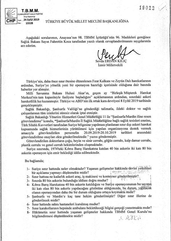yeniakit.com.tr CHP İzmir Milletvekili Sevda Erdan Kılıç’ın, 24 Eylül 2019 tarihinde, Barış Pınarı Harekatı gündeme geldikten sonra, bakanlığın Mehmetçik için sınırda aldığı sağlık önlemleriyle ilgili TBMM’ye soru önergesi verdiği ortaya çıktı. Kılıç’ın, soru önergesinde, devletin sır gibi saklanan bilgileri açıklamasını istediği ve alınan tedbirlerle ilgili eleştirel üslup kullandığı belirlendi. Aynı zamanda CHP’li vekilin, ileride alınacak tedbirlerin de açıklanmasını istediği görüldü.