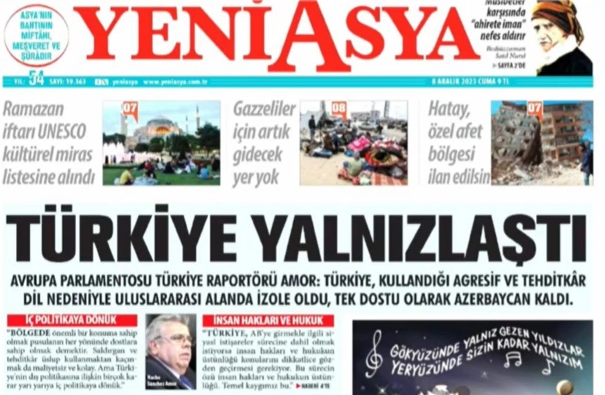 Yeni Asya gazetesi, Avrupa Parlamentosu Türkiye Raportorü'nün ülkemizi Azerbaycan ve Filistin halkına destek vermemizden dolayı hedef aldığı sözlerini destekledi.