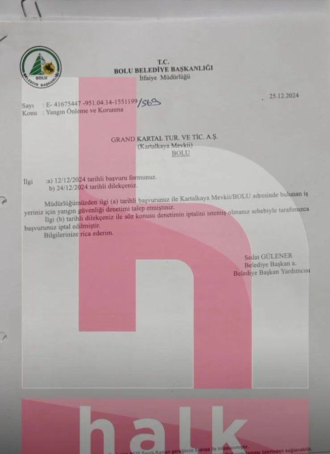 Bolu Belediyesi Başkanlığı İtfaiye Müdürlüğü'nün 2 Ocak 2025'te Kartalkaya'da yanan otelin restoranına "yangın yeterlilik belgesi" verdiği ortaya çıktı. İtfaiye raporunda, otelde inceleme yapıldığı, herhangi bir aksaklığa işaret etmediği görüldü.