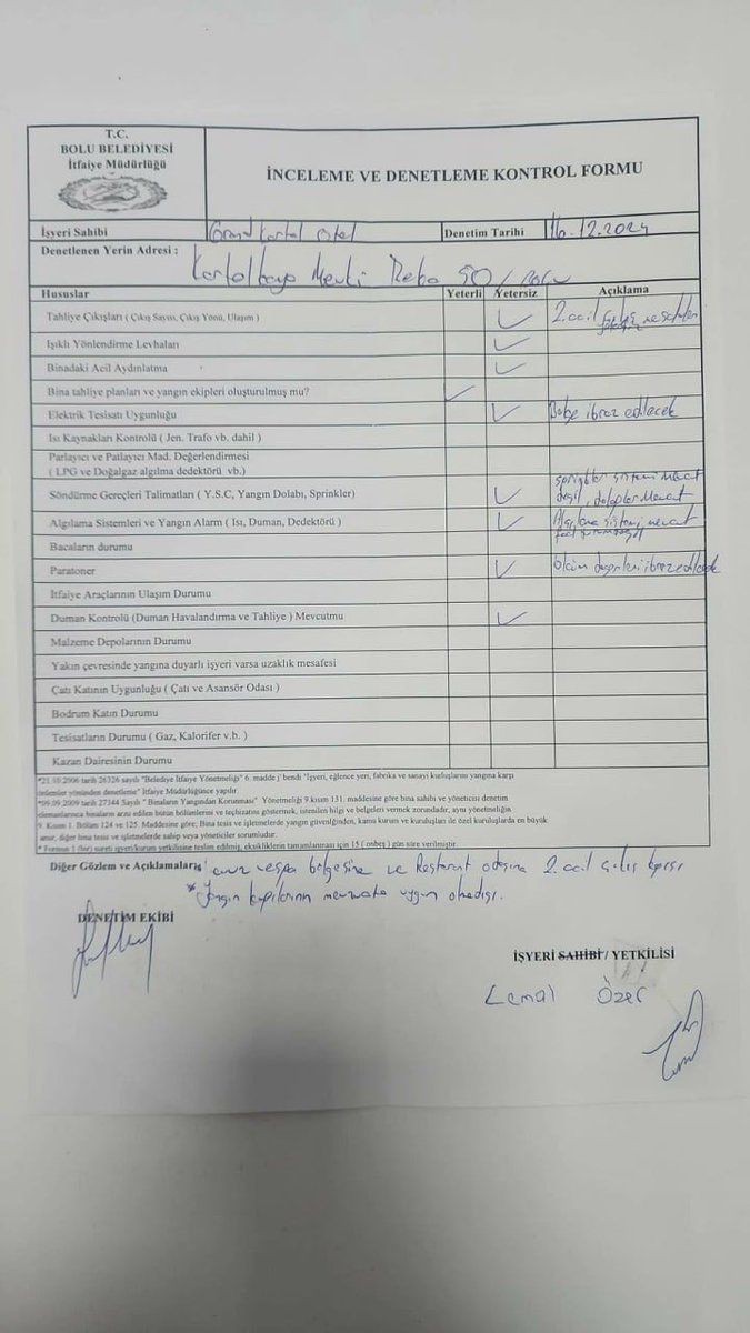 2 Ocak 2025 tarihinde, Bolu Belediyesi İtfaiye Müdürlüğü tarafından otelin restoran bölümünde bir yangın güvenliği denetimi gerçekleştirildiği ve herhangi bir olumsuzluğa rastlanmadığı rapor edildi.