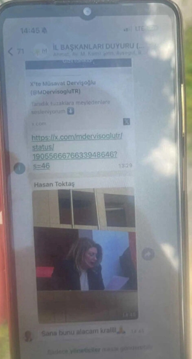 İyi Parti Genel Başkanı Müsavat Dervişoğlu PKK’yı feshettiren liderlere vıdı vıdı ederken kendi vekiline bile sahip çıkamıyor! İYİ Parti Teşkilat Başkanı ve Bursa Milletvekili Hasan Toktaş, CHP Osmaniye Milletvekili Asu Kaya'nın fotoğrafını İYİ Partili il başkanlarının olduğu WhatsApp grubuna gönderip "Sana bunu alacağım kral" yazdı. Tepkilerin odağına yerleşen Toktaş, kendisinin gönderdiği iddia edilen mesaj ile ilgili açıklama yaptı.