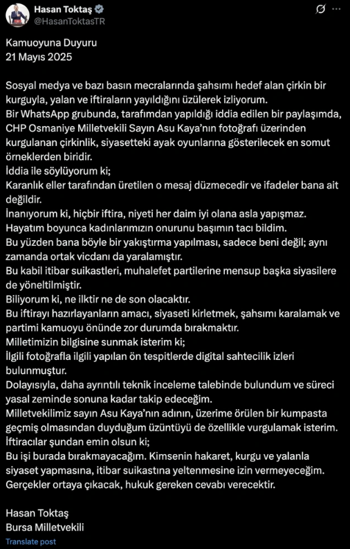 Toktaş'tan konuyla ilgili ilk açıklama geldi. Toktaş, "Sosyal medya ve bazı basın mecralarında şahsımı hedef alan çirkin bir kurguyla, yalan ve iftiraların yayıldığını üzülerek izliyorum. Bir WhatsApp grubunda, tarafımdan yapıldığı iddia edilen bir paylaşımda, CHP Osmaniye Milletvekili Sayın Asu Kaya’nın fotoğrafı üzerinden kurgulanan çirkinlik, siyasetteki ayak oyunlarına gösterilecek en somut örneklerden biridir. İddia ile söylüyorum ki; Karanlık eller tarafından üretilen o mesaj düzmecedir ve ifadeler bana ait değildir." dedi ardından şu ifadeleri kullandı: