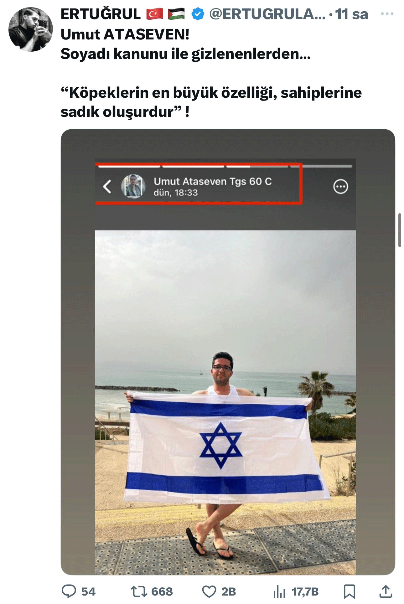 Türkiye genelinde Filistin’e destek yürüyüşleri yapıldığı sırada, Independent Türkçe yazarı Umut Atasever, sosyal medya hesabından skandal bir paylaşım yaptı. Aynı zamanda akademisyen olan Atasever, soykırımcı İsrail’in bayrağını tuttuğu fotoğrafını yayınladı.