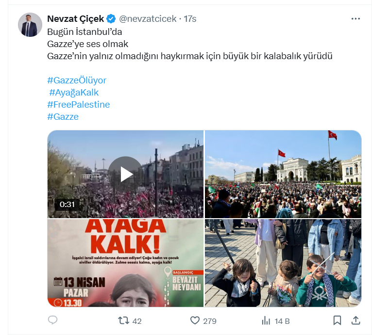 Independent Türkçe’nin Genel Yayın Yönetmeni Nevzat Çiçek, dün İstanbul’da düzenlenen Gazze yürüyüşünün görüntülerini kendi sosyal medya hesabından paylaştı. Çiçek’in Filistin yanlısı tavır sergilemesine rağmen yanında çalışanların açıkça “siyonist yalakalığı” yapması dikkatlerden kaçmıyor!.. Çelişkili duruma tepki gösteren duyarlı vatandaşlar, “Bu ne iş Nevzat, ikili mi oynuyorsunuz?” diyerek tepkilerini dile getiriyor.