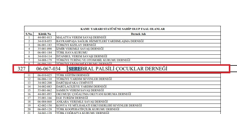 İçişleri Bakanlığı Dernekler Masası'nda 327 06-067-034 Kütük Numarası ile kayıtlı Ankara merkezli faaliyet gösteren "Serebral Palsili Çocuklar Derneği"nin yer alması şaşkınlıkla karşılandı.