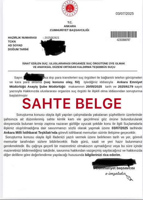 ANKARA Cumhuriyet Başsavcılığı, savcılık, emniyet ve Milli İstihbarat Teşkilatı (MİT) gibi kurumların isimlerini kullanarak hazırlanan sahte belgelerle dolandırıcılık yapıldığını belirterek, vatandaşların bu tür belgelere itibar etmemesi ve arayan numaraları engelleyerek, kolluk birimlerine başvurmaları konusunda uyardı.