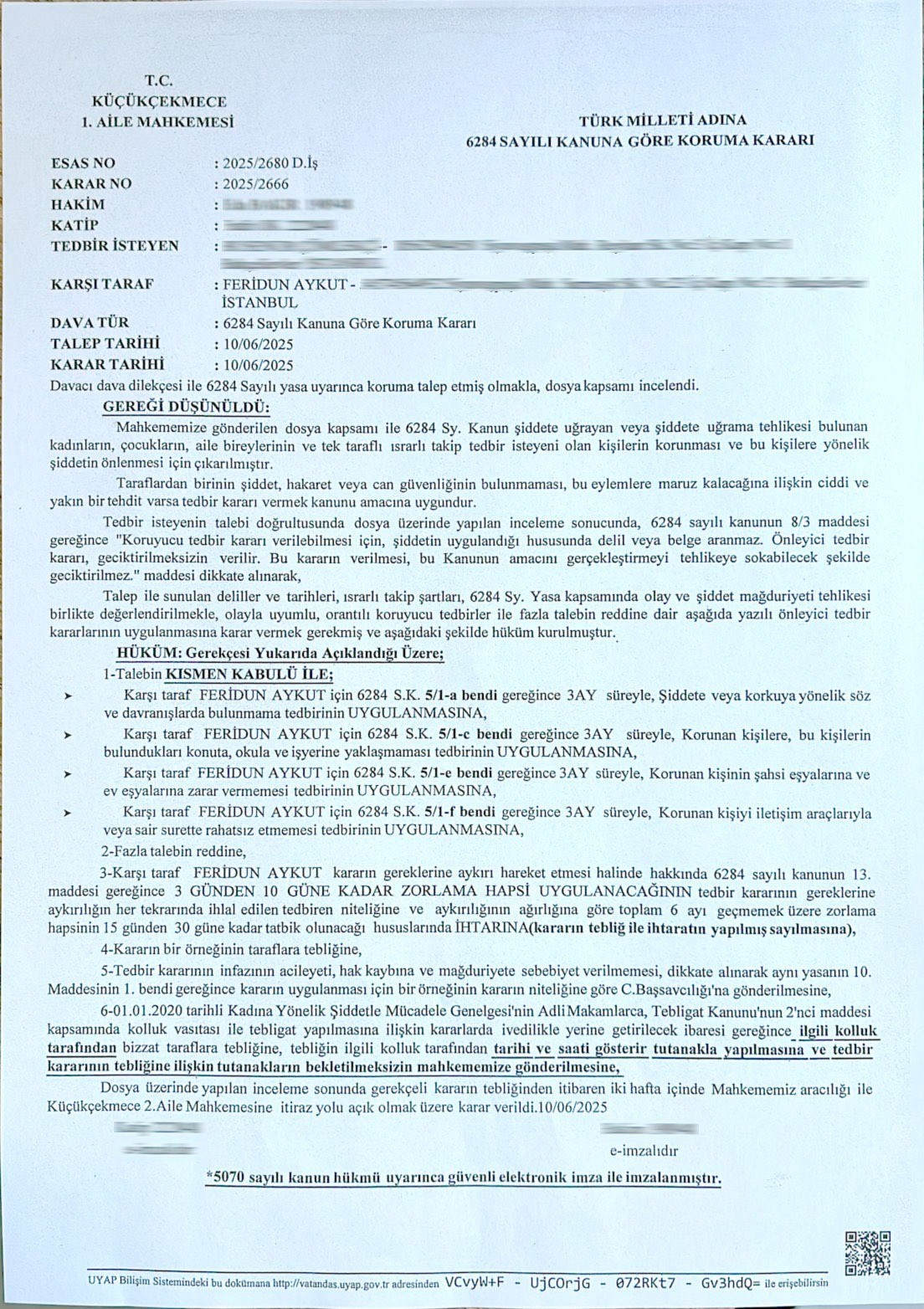 “Ben meclis üyesiyim, müdürün beni aramazsa belediyeye gelip gerekeni yaparım” diyerek çalışanı sindirmeye kalkıştı. Yaşanan bu skandal sonrası psikolojik şiddete uğrayan kadın personel mahkemeye başvurdu. Küçükçekmece 1. Aile Mahkemesi, belediye meclis üyesi sıfatını kullanarak kamu görevlisine baskı kurmaya çalışan Feridun Aykut hakkında 3 ay süreyle uzaklaştırma kararı çıkardı.