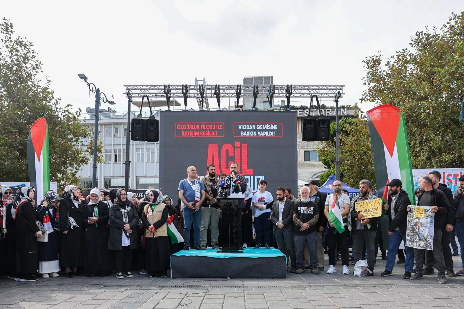 İHH İnsani Yardım Vakfı’nın günlerdir 24 saat boyunca “Nöbetteyiz” eylemi düzenlediği Eminönü Meydanı’nda gerçekleşen basın açıklamasına sivil toplum kuruluşu temsilcileri ve vatandaşlar katıldı. Basın açıklamasında konuşan Uluslararası Özgürlük Filosu Koalisyonu Komite Üyesi ABD’li aktivist Ann Wright, filonun Gazze’deki soykırımı durdurmak için yola çıktığını söyledi. Wright, “Onlar Sumud’un, Hanzala’nın, Madleen’in yolunu takip ediyorlar. Bunlar ablukayı kırmaya çalışan son gemiler olmayacak. Önümüzdeki ay ablukayı kırmak için çok daha fazla gemimiz olacak. Gazze ve tüm Filistin özgür oluncaya kadar denizlere açılmaya devam edeceğiz” dedi.
