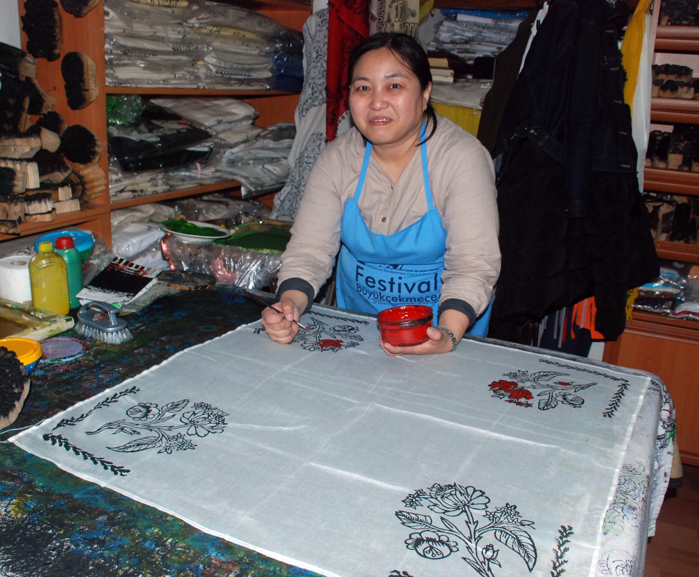 Tarihi Taşhan’da el baskısı yazmacılığının yaşatan isimlerden Yurdanur Uçar’dan yazmacılık tekniği konusunda Satoko Narihara’ya kurs vermeye başladı. İlk defa Japonyalara yazmacılık öğrettiğini ifade eden Uçar, “Yazmacılığın ilk baştan başlayarak tüm şekillenmesini görecekler. Yani kara kalem baskıdan tutun kumaş olarak neyi seçtiğimize varana kadar öğretmeye çalışacağız. Yazmacılık sanatına ilgi fazla ama belirli bir noktada kalınıyordu ilk defa Japonlardan böyle bir teklif geldi. İlk defa bir yabancıya yazmacılık öğretiyorum. İkumi hanım Türkçe bildiği için iletişim kurmakta zorlanmıyoruz” şeklinde konuştu.
