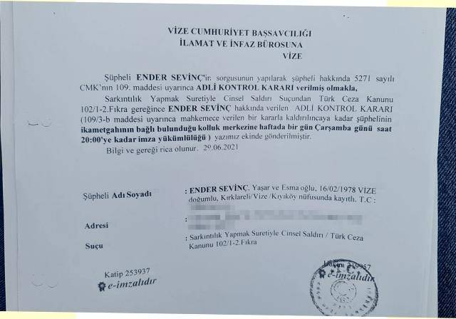 Belediyede çalışan 2 kadın personeli taciz ettiği iddia edilen Kıyıköy Belediye Başkanı Ender Sevinç, adli kontrol şartı ile serbest bırakıldı.İddialara göre, 2019 yerel seçimlerinde Kıyıköy Belediye Başkanlığı'nı kazanan CHP'li Ender Sevinç, bir süre önce belediye çalışan 2 kadın personele taciz uyguladı. Taciz edilen kadınlar Başkan Sevinç hakkında şikayetçi oldu. Kıyıköy Belediye Başkanı Ender Sevinç hakkında, belediyedeki 2 kadın çalışana sarkıntılık ettiği iddiasıyla Vize Cumhuriyet Başsavcılığı tarafından iddianame hazırlandı. İki kadın çalışanın şikayeti üzerine Nöbetçi Mahkemeye çıkan Belediye Başkanı Ender Sevinç, 'Sarkıntılık yapmak suretiyle cinsel saldırı suçundan TCK'nın 102/1-2. Fıkrası gereğince' adli kontrol şartıyla serbest bırakıldı.