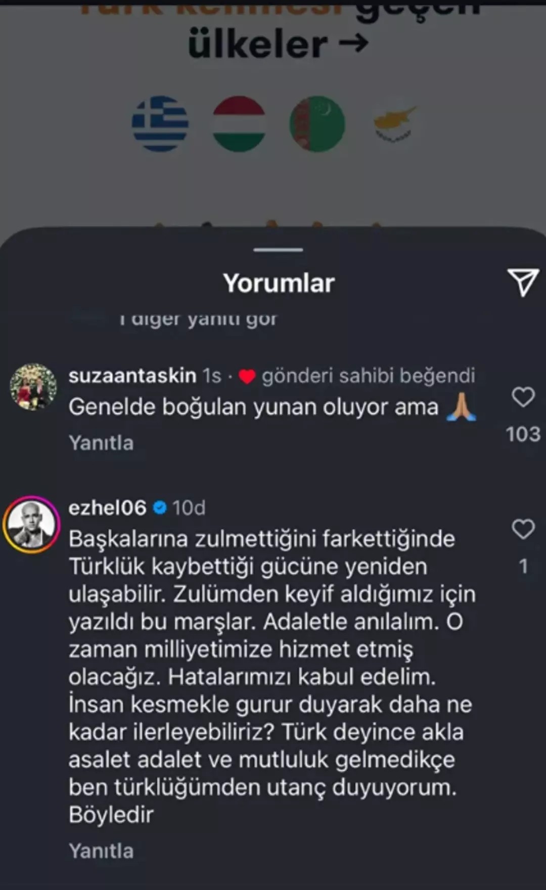 Rapçi Ezhel’in bir Instagram hesabının ‘Milli marşında Türk kelimesi geçen ülkeler’ derleme postuna yaptığı yorum dikkatlerden kaçmadı.