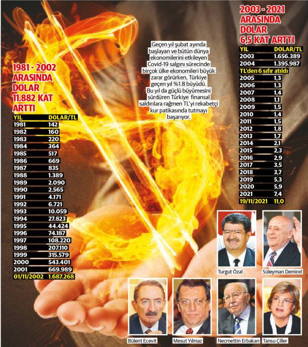 AK Parti’yi kapatma davası, e-muhtıra, Gezi olayları, 17/25 Aralık hükümeti devirme girişimi, 15 Temmuz darbe girişimi, ABD'nin Rahip Brunson olayı üzerinden başlattığı ve hala devam eden finansal saldırılar ve zorlu Kovid-19 sürecine rağmen Erdoğan’ın 19 yıllık iktidarında dolar kuru sadece 6,5 kat arttı. Erdoğan iktidara geldiği Kasım 2002’de 1 dolar tam olarak 1 milyon 687 bin 268 Türk lirasına karşılık geliyordu. Koalisyonlar döneminde zayıf düşen TL, AK Parti’nin iktidarıyla kendine geldi.