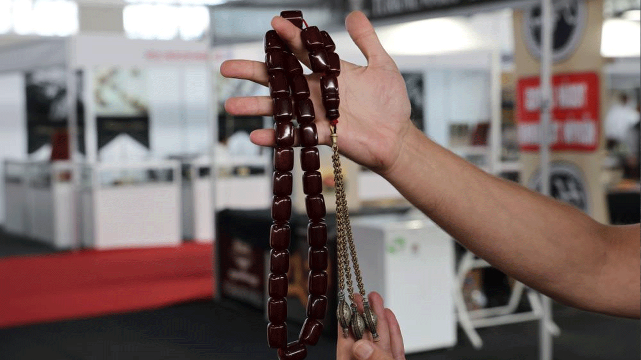 Adana'da Tespih ve Doğal Taşlar Fuarı'nda sergilenen kehribar tespih, 50 bin dolarlık fiyatıyla dikkat çekiyor.
