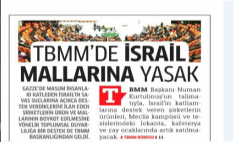 TBMM Başkanı Numan Kurtulmuş'un talimatıyla, Meclis yerleşkesindeki lokanta, kafeterya ve çay ocaklarında terörist İsrail'e destek veren şirketlerin ürünlerinin satılmaması kararlaştırıldı.