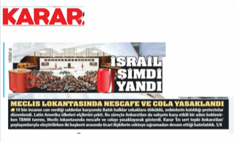 Gazze’de masum insanları katleden İsrail’in savaş suçlarına açıkça destek verdiklerini ilan eden şirketlerin ürün ve mallarının boykot edilmesine yönelik toplumsal duyarlılığa bir destek de Türkiye Büyük Millet Meclisi (TBMM) Başkanlığından geldi. TBMM'nin takdir toplayan hassasiyetini hedef alan Ahmet Davutoğlu'nun arpasını verdiği Karar Gazetesi aklınca dalga geçti. Karar'ın rezilliğini değerlendiren Yeni Akit Gazetesi Sorumlu Yazı İşleri Müdürü Ali İhsan Karahasanoğlu "TBMM bir kararlılıkla hassasiyet göstermiş ve bu kararı desteklemesi gereken 'yetmez, daha fazlasını istiyoruz' demesi gereken Karar Gazetesi, Milli Gazete ile bizimle dalga geçiyor." dedi.