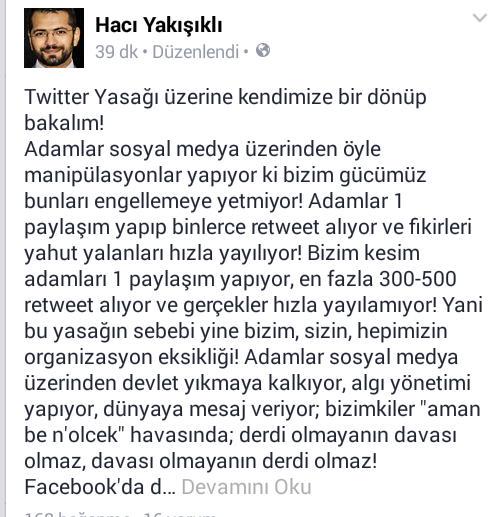Adamlar sosyal medya üzerinden öyle manipülasyonlar yapıyor ki bizim gücümüz bunları engellemeye yetmiyor! Adamlar 1 paylaşım yapıp binlerce retweet alıyor ve fikirleri yahut yalanları hızla yayılıyor! Bizim kesim adamları 1 paylaşım yapıyor, en fazla 300-500 retweet alıyor ve gerçekler hızla yayılamıyor! Yani bu yasağın sebebi yine bizim, sizin, hepimizin organizasyon eksikliği! Adamlar sosyal medya üzerinden devlet yıkmaya kalkıyor, algı yönetimi yapıyor, dünyaya mesaj veriyor; bizimkiler "aman be n'olcek" havasında; derdi olmayanın davası olmaz, davası olmayanın derdi olmaz! Facebook'da da yeterince güçlü değiliz!