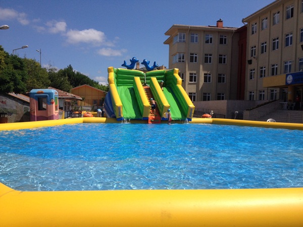 Okulların kapanması ile birlikte çocuklara bir birinden farklı eğitim ve etkinlikler hazırlayan Ümraniye Belediyesi 7-14 yaş arası çocuklar için ücretsiz 15 farklı okulun bahçesine portatif yüzme havuzu kurdu.