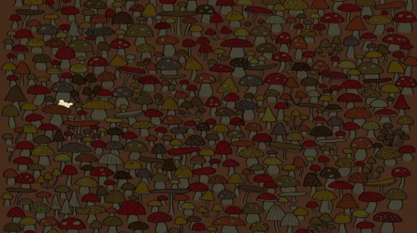 Verilen sürede fareyi bulamadıysanız veya gözleriniz hâlâ fareyi arıyorsa resmin sol orta kısmına bakabilirsiniz. Küçük fare turuncu, benekli mantarın arkasından bize bakıyor."