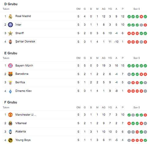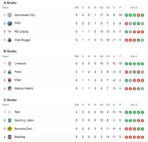UEFA Şampiyonlar Ligi 7 Aralık Salı maçları şu şekilde: